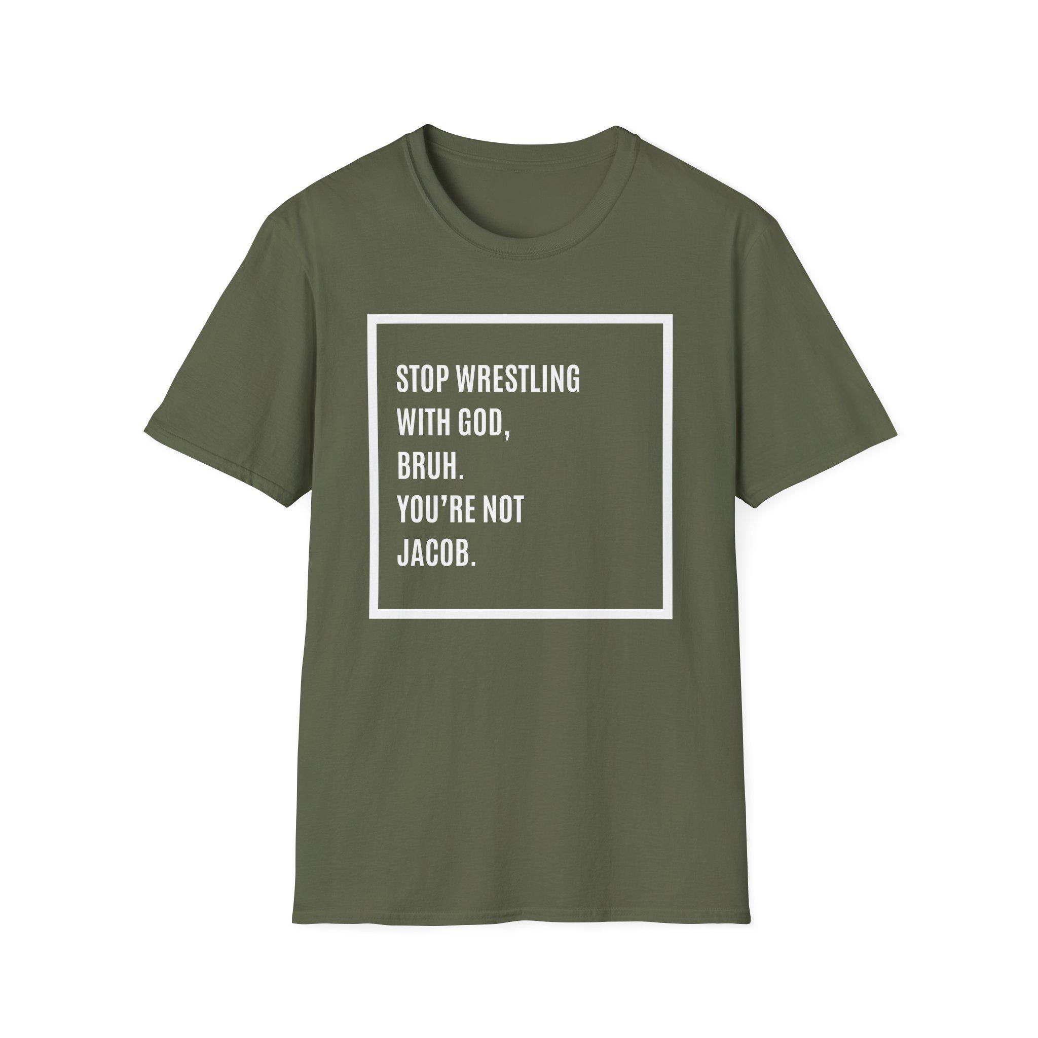 A Christian-themed T-Shirt featuring the words 'stop wrestling with God Bruh You're not jacob'. This softstyle T-Shirt is made from durable and smooth fabric, perfect for printing. It offers a clean and versatile style that can match any occasion, providing total wearing comfort to adults. Ideal for those looking for a unique Christian shirt to wear on casual days or during religious gatherings.