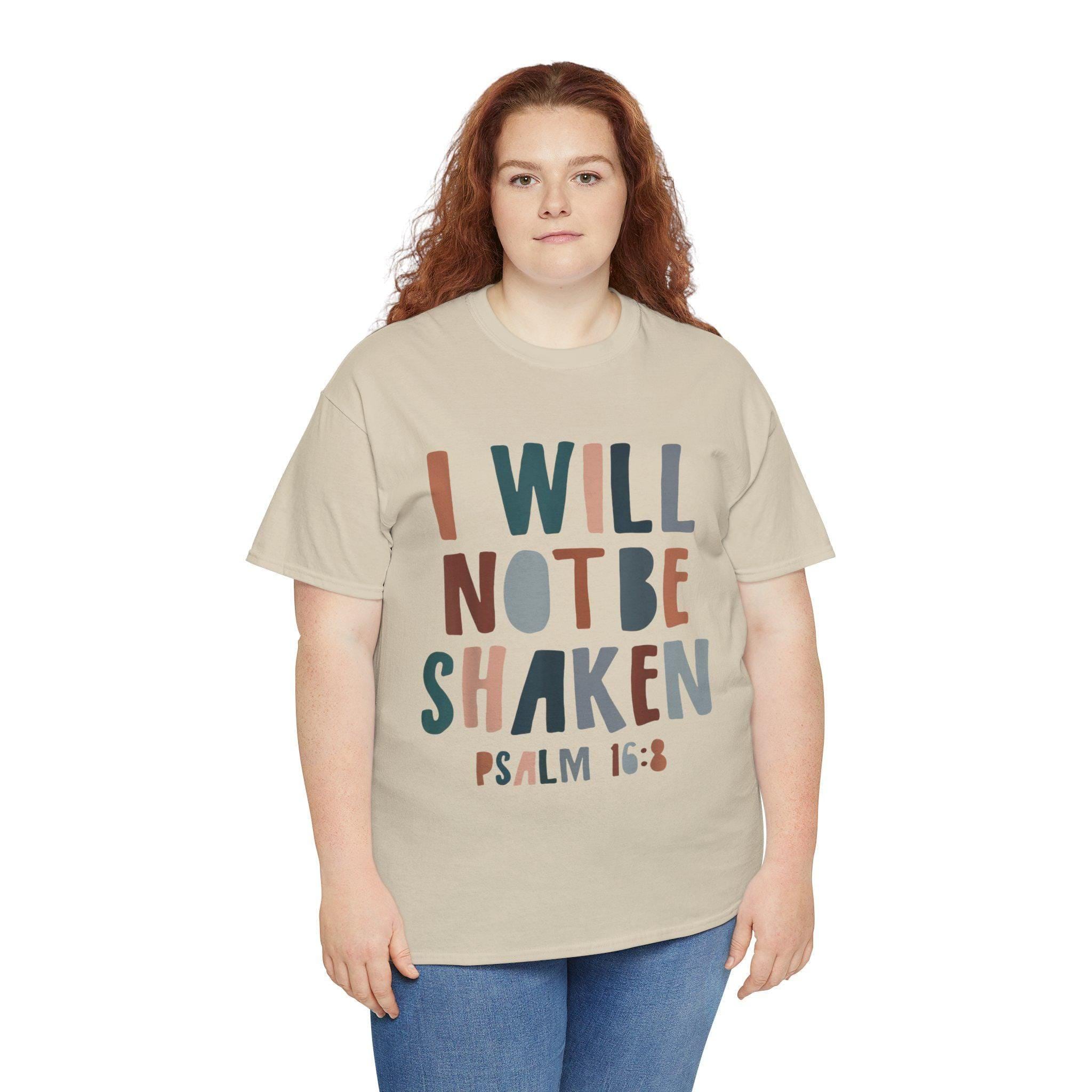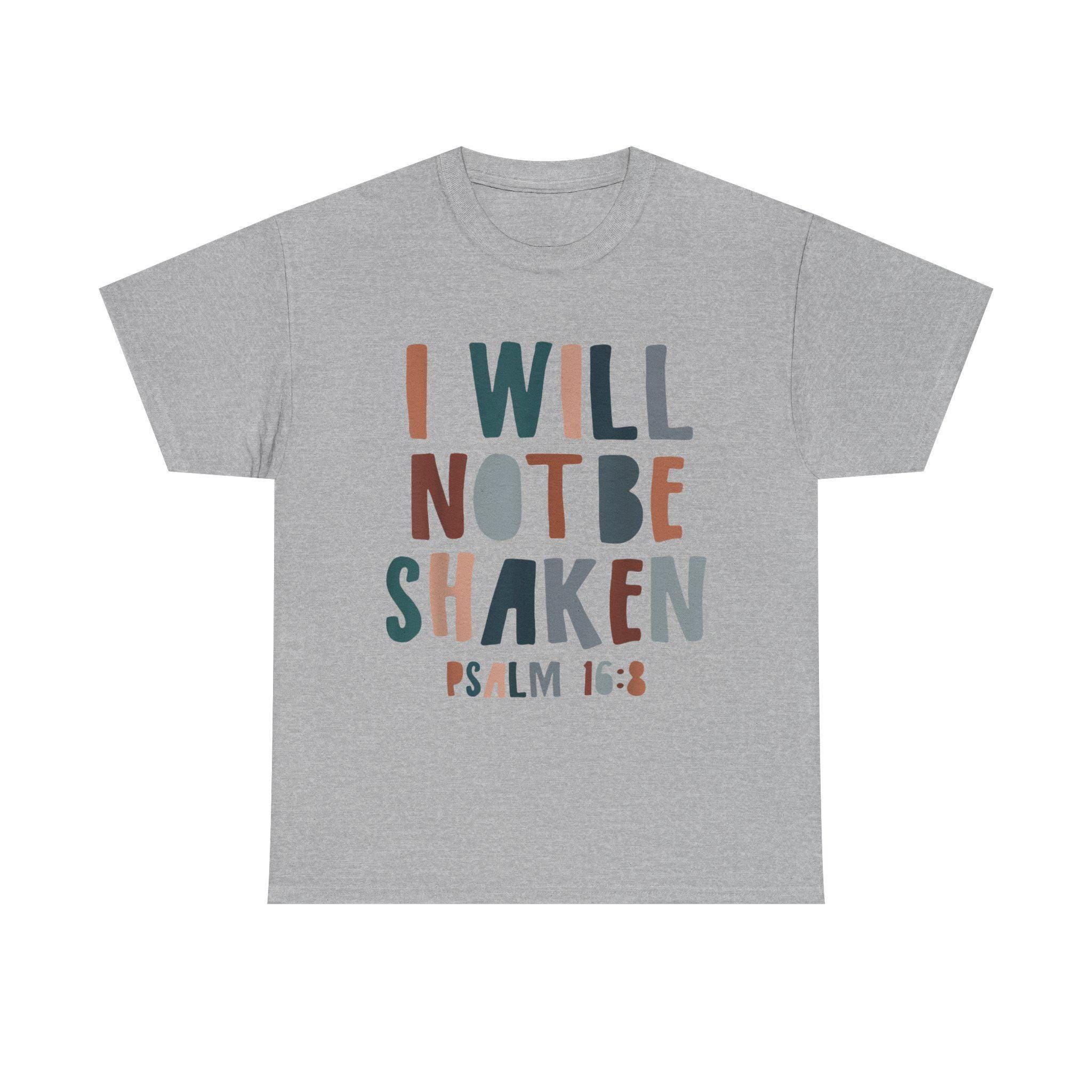 This Christian t-shirt features the message 'I will not be shaken' for those who seek strength and faith in their daily lives. Made from high-quality, specially spun fibers, this unisex heavy cotton tee is perfect for printing and offers comfort and durability year-round. The classic fit and crew neckline make it suitable for casual or semi-formal occasions, providing a neat and timeless look. Ideal for adults looking to express their Christian beliefs and find inspiration in their everyday wear.Product features- High-quality fabric for printing- Classic fit for comfort- Versatile for any occasion- Ethically made with US cotton- Inspiring message for Christian believersCare instructions- Non-chlorine: bleach as needed- Do not iron- Do not dryclean- Machine wash: cold (max 30C or 90F)- Tumble dry: low heatEU representative: HONSON VENTURES LIMITED, gpsr [!at] honsonventures.com, 3, Gnaftis House flat 102, Limassol, Mesa Geitonia, 4003, CY Product information: Gildan 5000, 2 year warranty in EU and Northern Ireland as per Directive 1999/44/EC Warnings, Hazard: For adults, Made in Nicaragua Care instructions: Machine wash: cold (max 30C or 90F), Non-chlorine: bleach as needed, Tumble dry: low heat, Do not iron, Do not dryclean